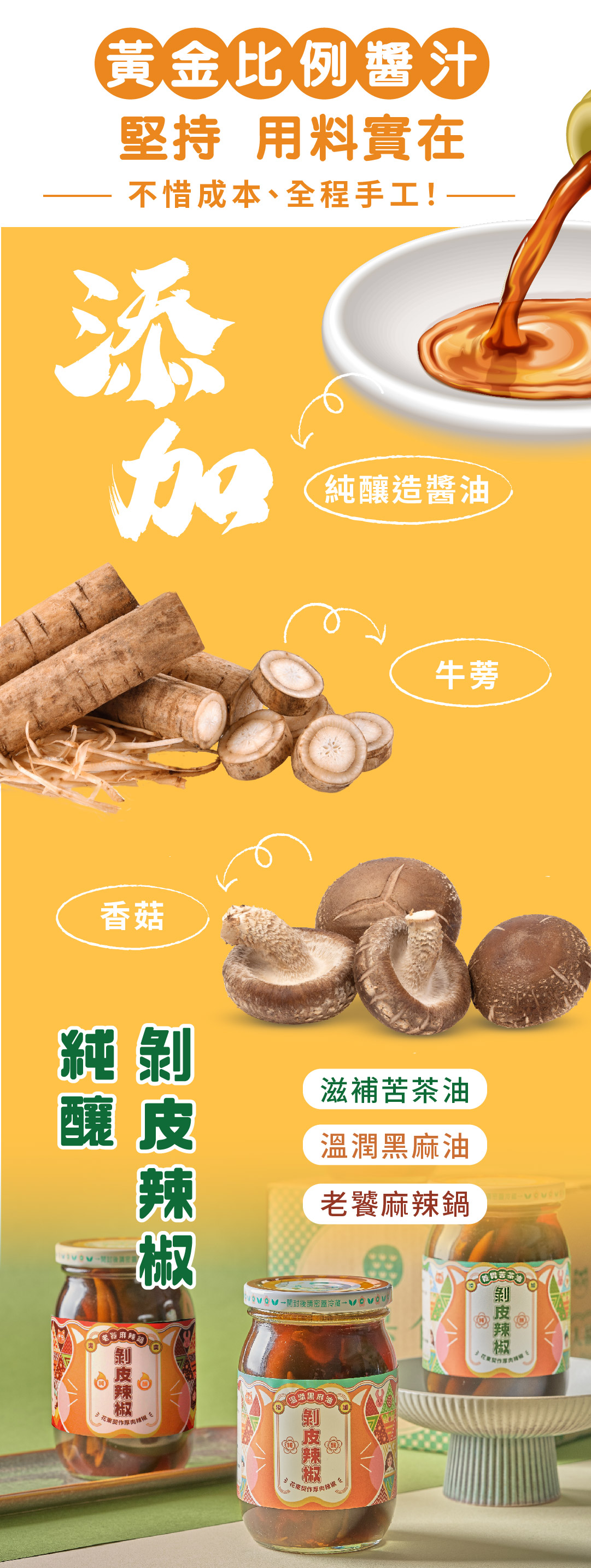 苦茶油口味:青辣椒、醬油、牛蒡、香菇、糖、鹽、乳酸、水、苦茶油