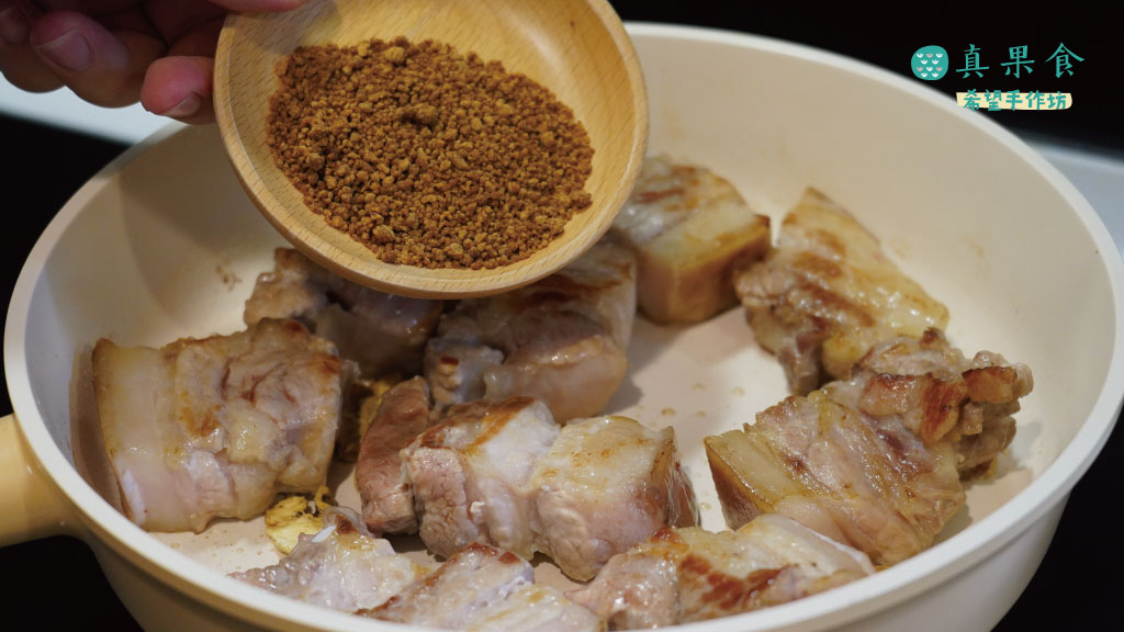 2. 準備鍋子,將五花肉下鍋炒出油,放入老薑乾片與黑糖炒香、炒上色後,起鍋備用
