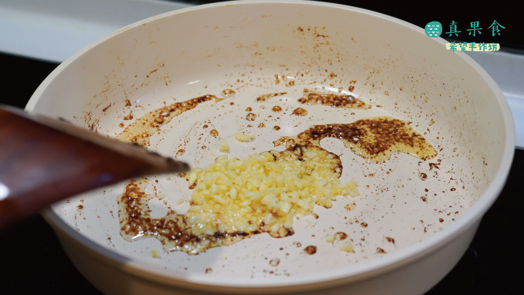 3. 加入苦茶油,蒜頭、梅干菜乾下鍋炒香炒乾