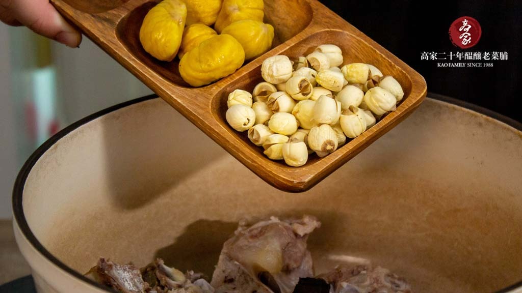 2.準備湯鍋,放入排骨、老菜脯、雪梨、蓮子、栗子、玉米和水2500cc