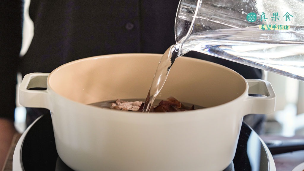 2.準備鍋子,放入排骨、老薑乾片、黑木耳、水2000cc,水滾後燉煮15分鐘