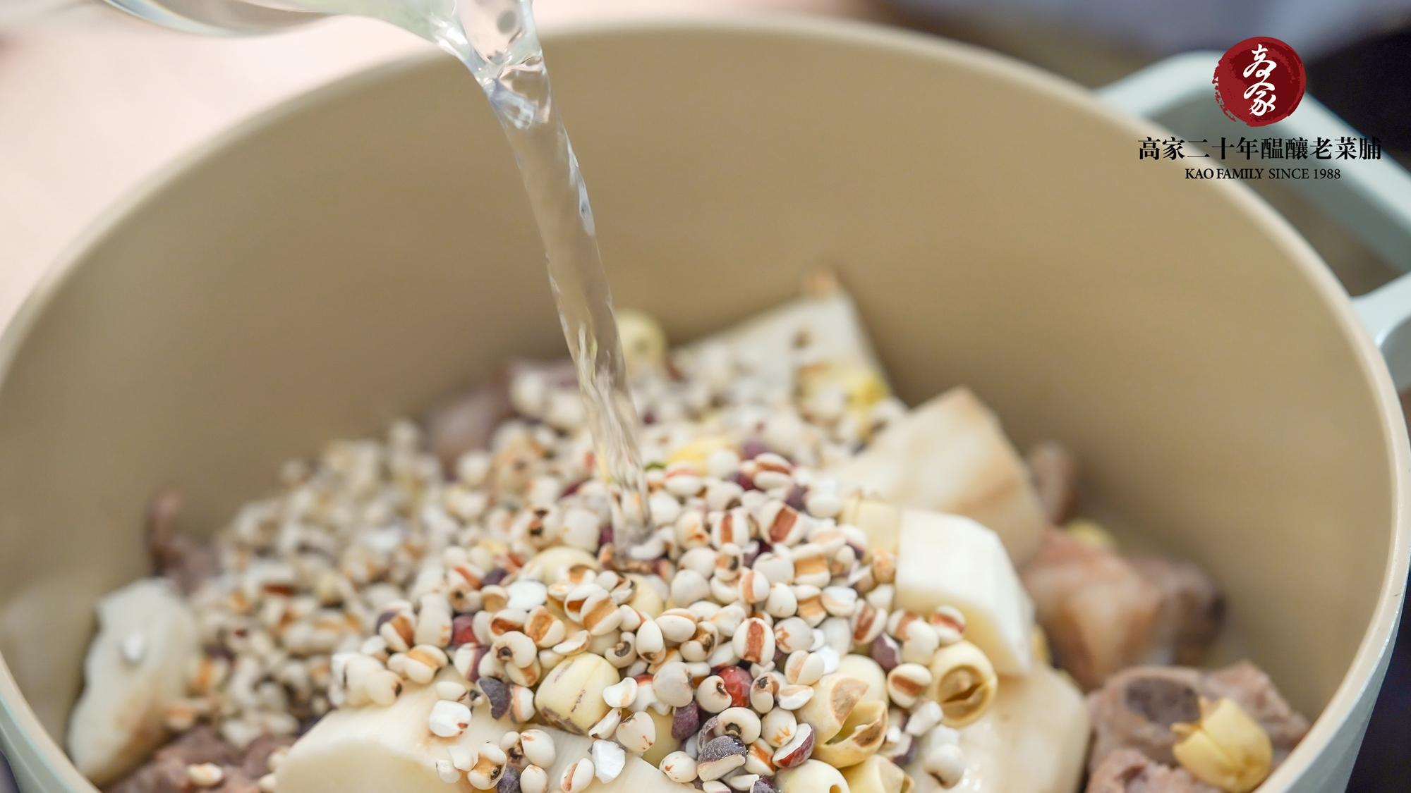 2.準備鍋子,放入老菜脯、排骨、山藥、薏仁、茨實、蓮子和水2000cc