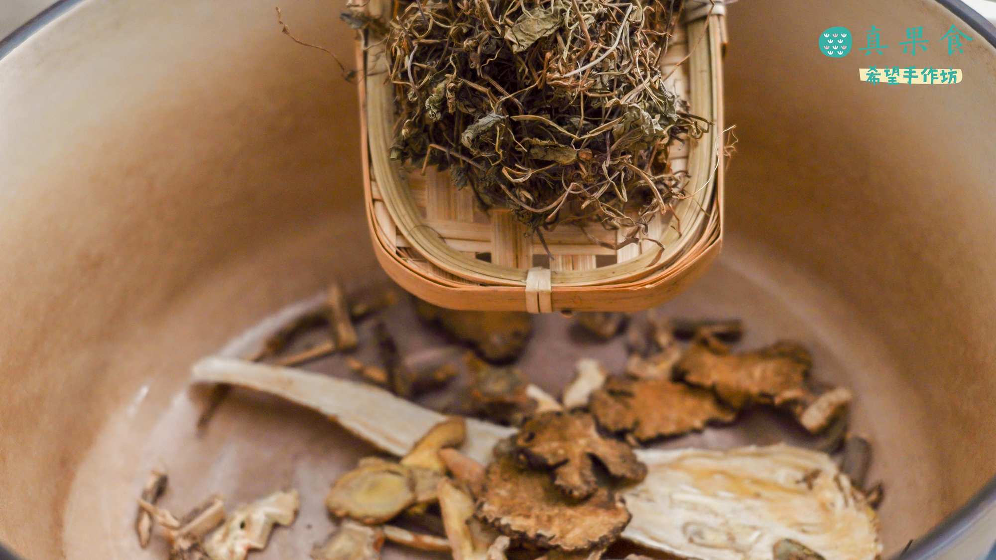 2.準備鍋子,放入九層塔頭、紅骨含殼草、川七、當歸、川芎、老薑和水2000cc,燉煮湯頭20分鐘