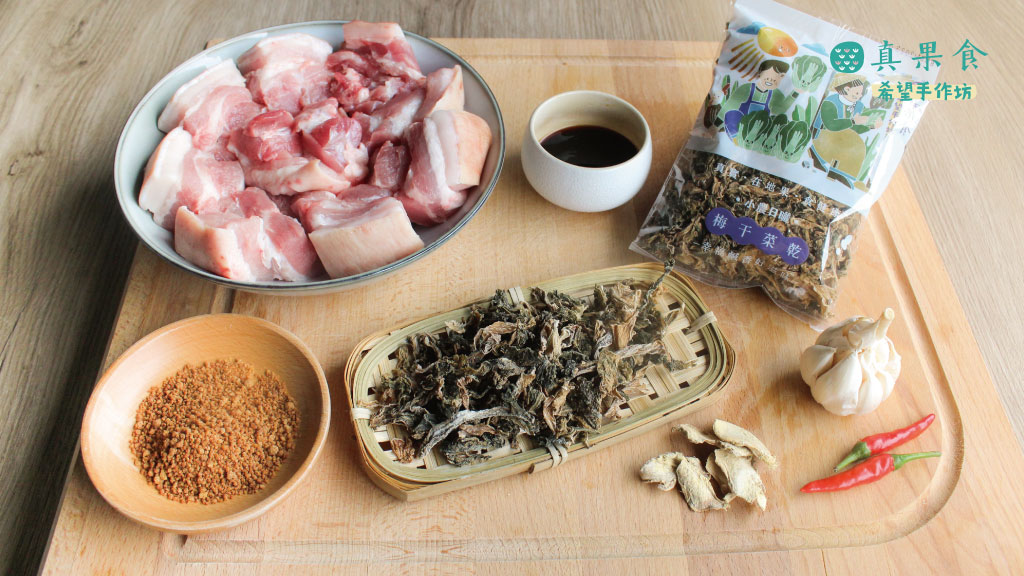 1. 將蒜頭切末、梅干菜乾泡水洗淨2-3次後,瀝乾切碎備用
