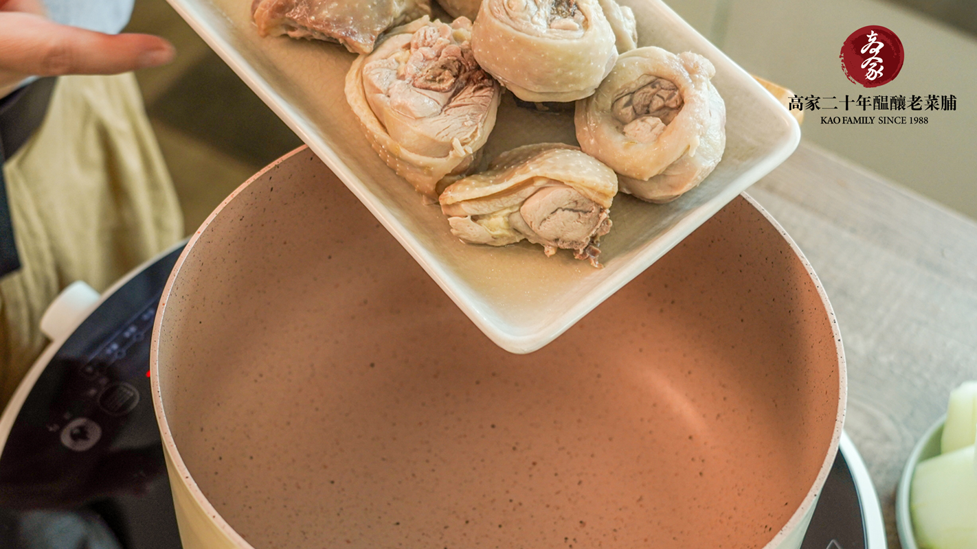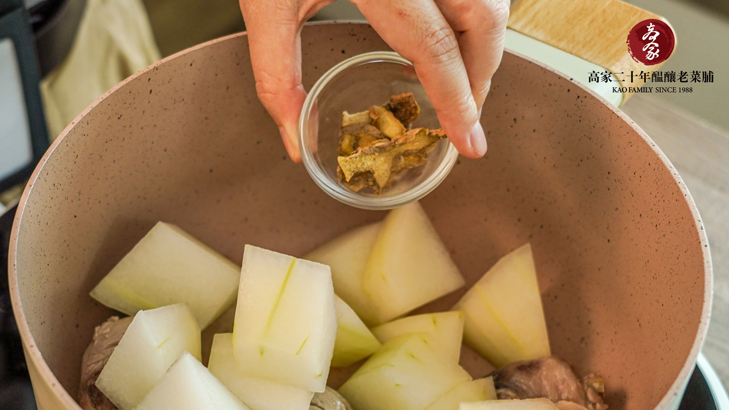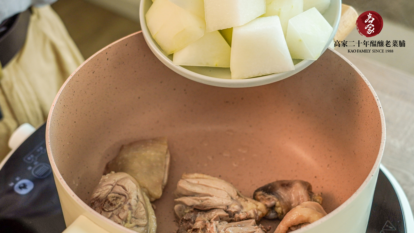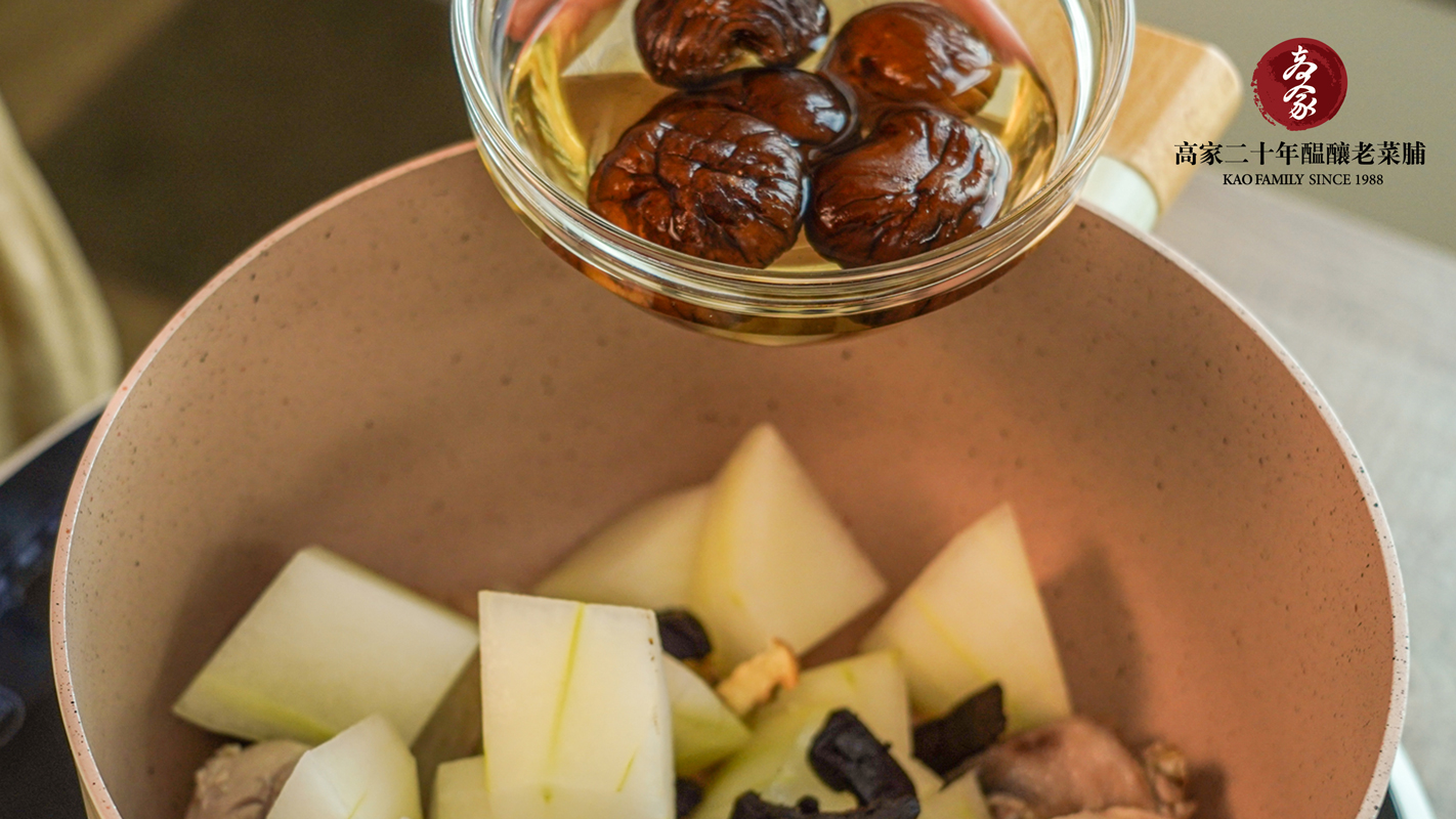 2.準備鍋子,放入雞肉、老菜脯、冬瓜、老薑乾片、香菇、水2000cc