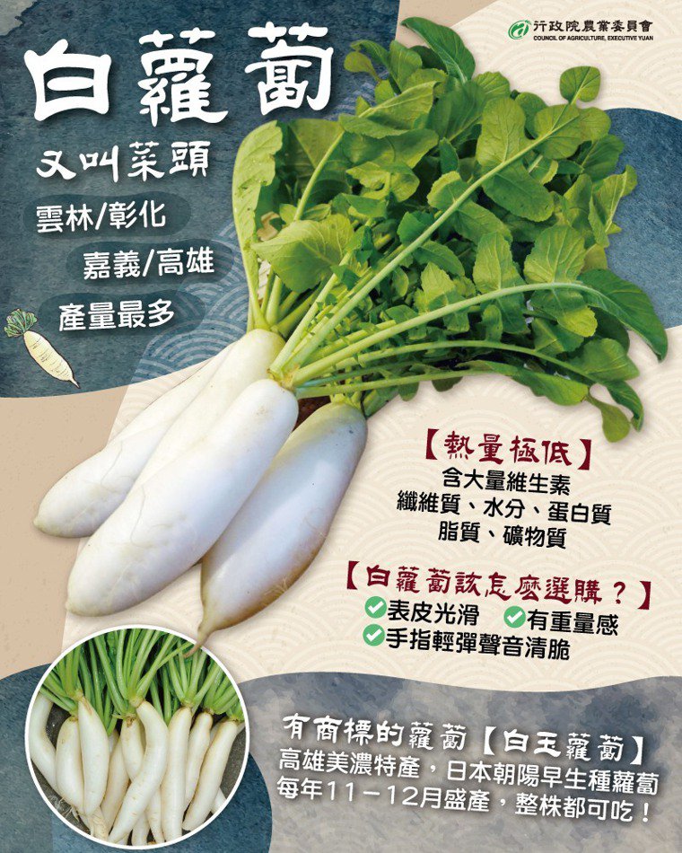 農委會表示,白蘿蔔屬於十字花科作物,生長迅速、栽培容易,且熱量極低,富含大量維生素、纖維質、水分、蛋白質、脂質、礦物質等,是一項健康食材。台灣北中南都有產白蘿蔔,其中雲林、彰化、嘉義、高雄產量最多。