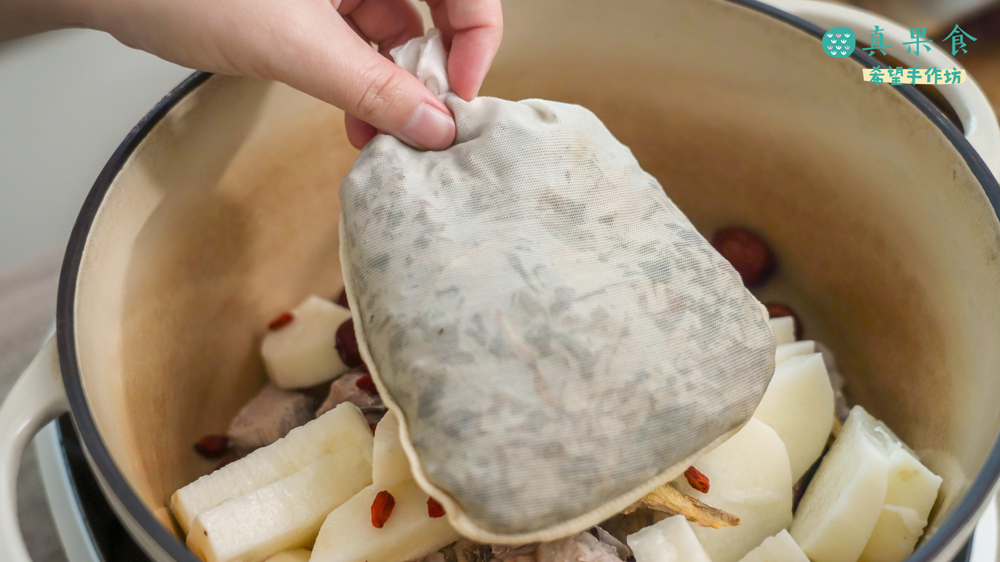 2.準備鍋子,放入排骨、山藥、紅棗、老薑乾片、枸杞、魚腥草燉包和水2000cc