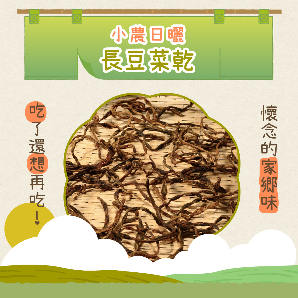 1.客家代表!讓人懷念家鄉的好滋味~ 2.陽光日曬,無添加物、防腐劑 3.適合煮湯、煮粥,香氣迷人! _______________________________ 內容物:小農日曬之長豆菜乾 內容量:單包45g±5% ,一包可煮3-4人份料理 成分:長豆 產地:臺灣 保存期限:18個月 保存方式:放置陰涼乾燥處,避免碰水潮濕。開封後,建議冷藏存放 食用方法:清水沖洗,泡水10-30分鐘,可依個人口味調整泡水時間 備註:泡水瀝乾後切適口長度